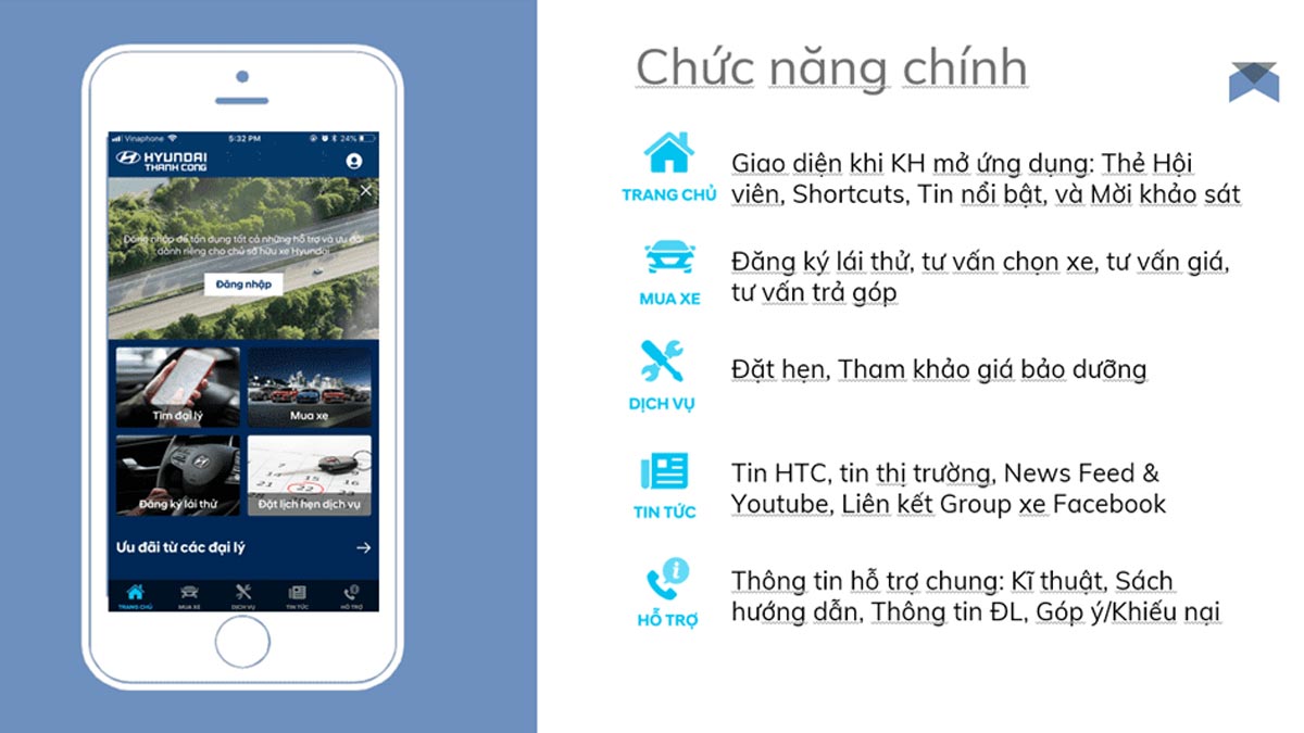 Trên cơ sở nền tảng Lấy Khách Hàng làm Trung tâm với tên gọi ứng dụng mang ý nghĩa về toàn bộ những điều Khách hàng mong muốn và có nhu cầu, Hyundai Thành Công cùng Đại lý phối hợp phát triển một ứng dụng với tiện ích thiết thực vừa đơn giản thân thiện cho Khách hàng với mục tiêu hỗ trợ tối đa trong mỗi hành trình trải nghiệm.