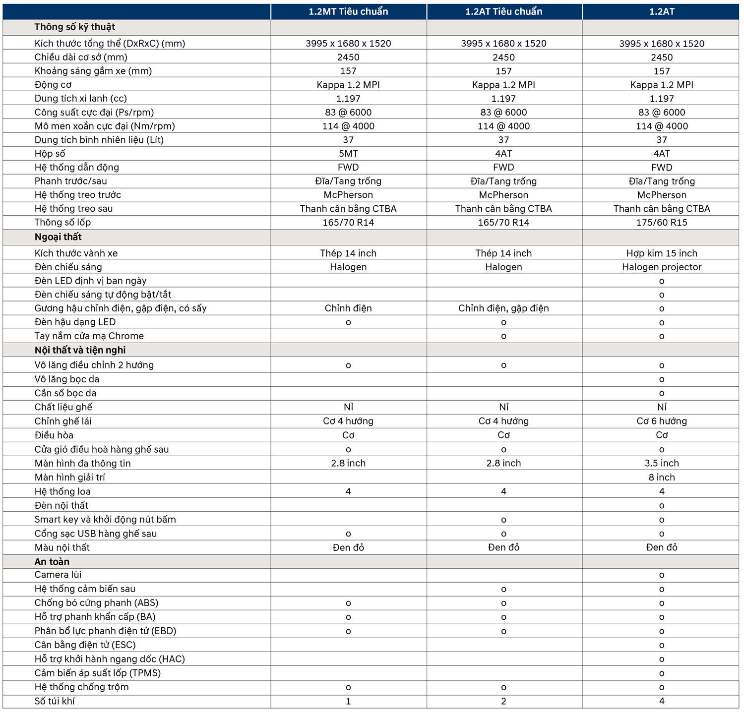Động cơ 4 xylanh Kappa dung tích 1.2L, đi cùng công nghệ van biến thiên CVVT, cho công suất cực đại 83 mã lực tại 6.000 vòng/phút và moment xoắn 114 Nm tại 4.000 vòng/phút.