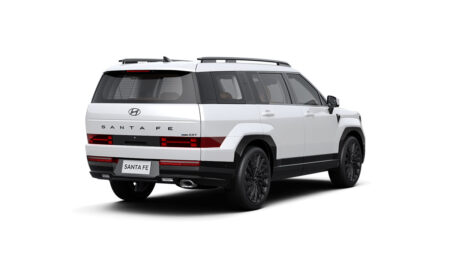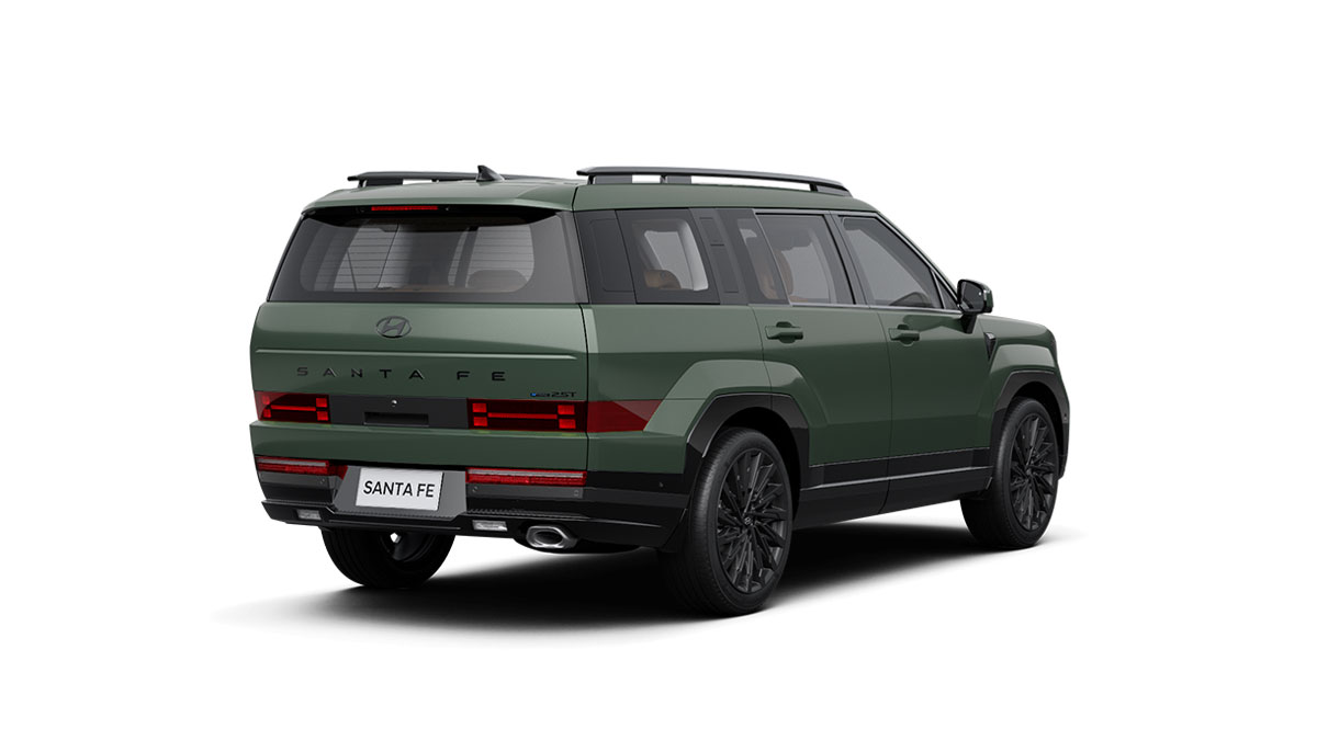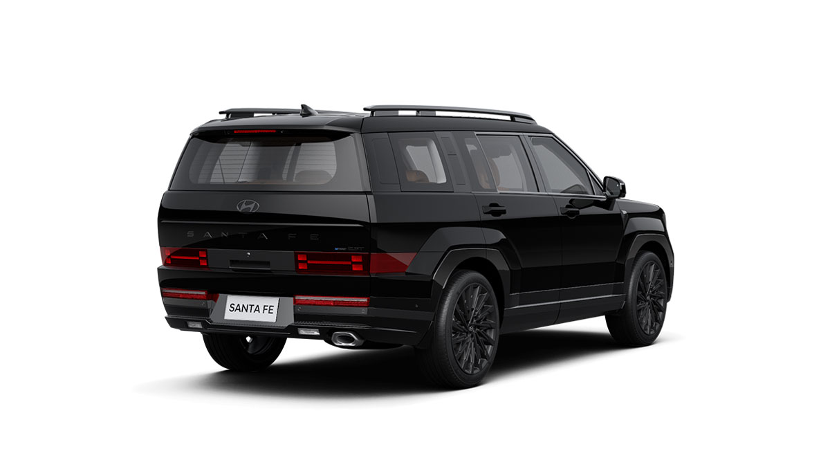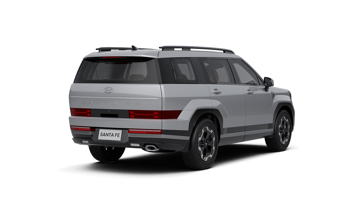All New Santa Fe cũng trở nên cứng cáp, góc cạnh hơn nhờ phần vòm bánh xe lồi ra, vuông vức. Thân xe thiết kế dạng phẳng tối giản, phù hợp với một chiếc SUV kích thước lớp cũng như giúp tối ưu hoá không gian bên trong. Phần đuôi xe tiếp tục sử dụng công nghệ LED với tạo hình đèn hậu hình chữ H đồng bộ với cụm đèn trước, gia tăng khả năng nhận diện khi di chuyển. Phần đuôi xe có thiết kế phẳng hài hoà trong tổng thể thiết kế khối hộp của xe cũng như gia tăng tiện ích với cốp điện tự động.