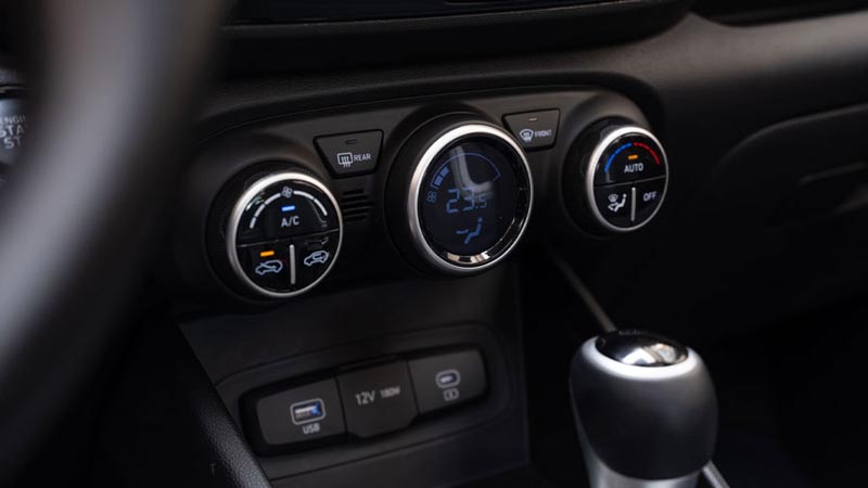 Hyundai Venue đươc trang bị nút bấm khởi động Start/Stop Engine cùng chìa khóa thông minh tích hợp khởi động từ xa. Hệ thống điều hòa tự động với khả năng làm mát nhanh và sâu, kết hợp cùng cửa gió cho hàng ghế sau đem đến không gian dễ chịu cho cả người lái và hành khách. Hệ thống nhiệt độ được hiển thị đẹp mắt trên Vô lăng xe tích hợp các nút điều khiển thông số cài đặt, chuyển nhạc, nhận cuộc gọi đảm bảo tính tiện lợi và an toàn khi vận hành.