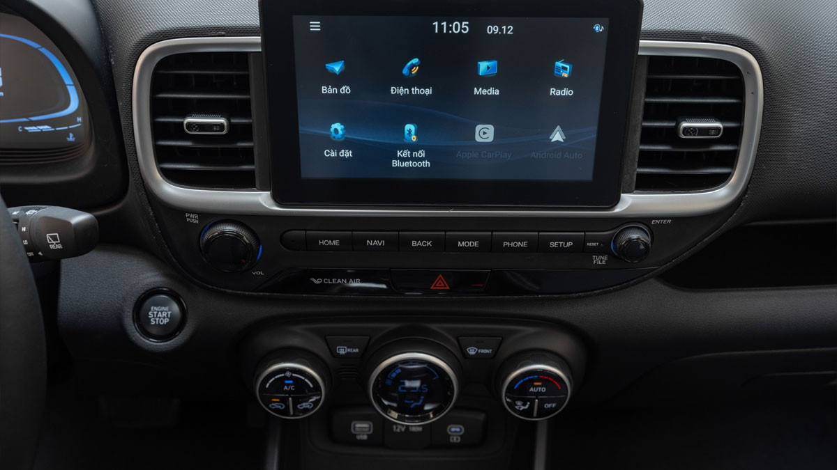 Bảng taplo xe nổi bật với màn hình đa thông tin và màn hình giải trí cảm ứng 8 inch điều khiển đa chức năng nằm ở vị trí trung tâm, tích hợp camera lùi. Màn hình của xe hỗ trợ đầy đủ kết nối Android Auto, Apple Carplay, Bluetooth cũng như bản đồ dẫn đường được Hyundai Thành Công phát triển riêng dành cho thị trường Việt Nam. Đặc biệt Venue cũng trang bị cổng sạc dạng USB Type-C tiện dụng nhất hiện nay với khả năng sạc nhanh trên cả hàng ghế phía trước và phía sau. Người dùng có thể hài lòng với hệ thống âm thanh 6 loa theo xe đạt chất lượng tốt.